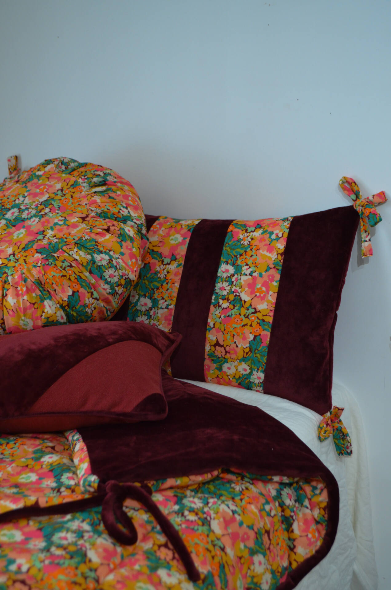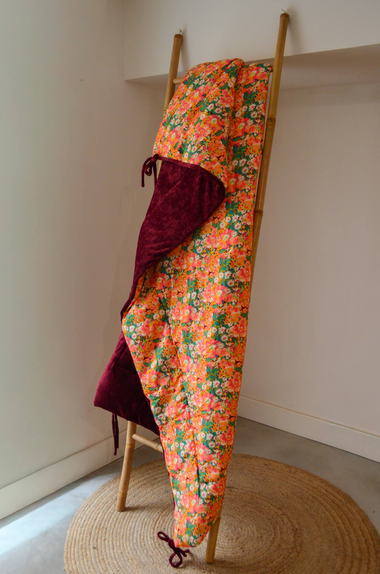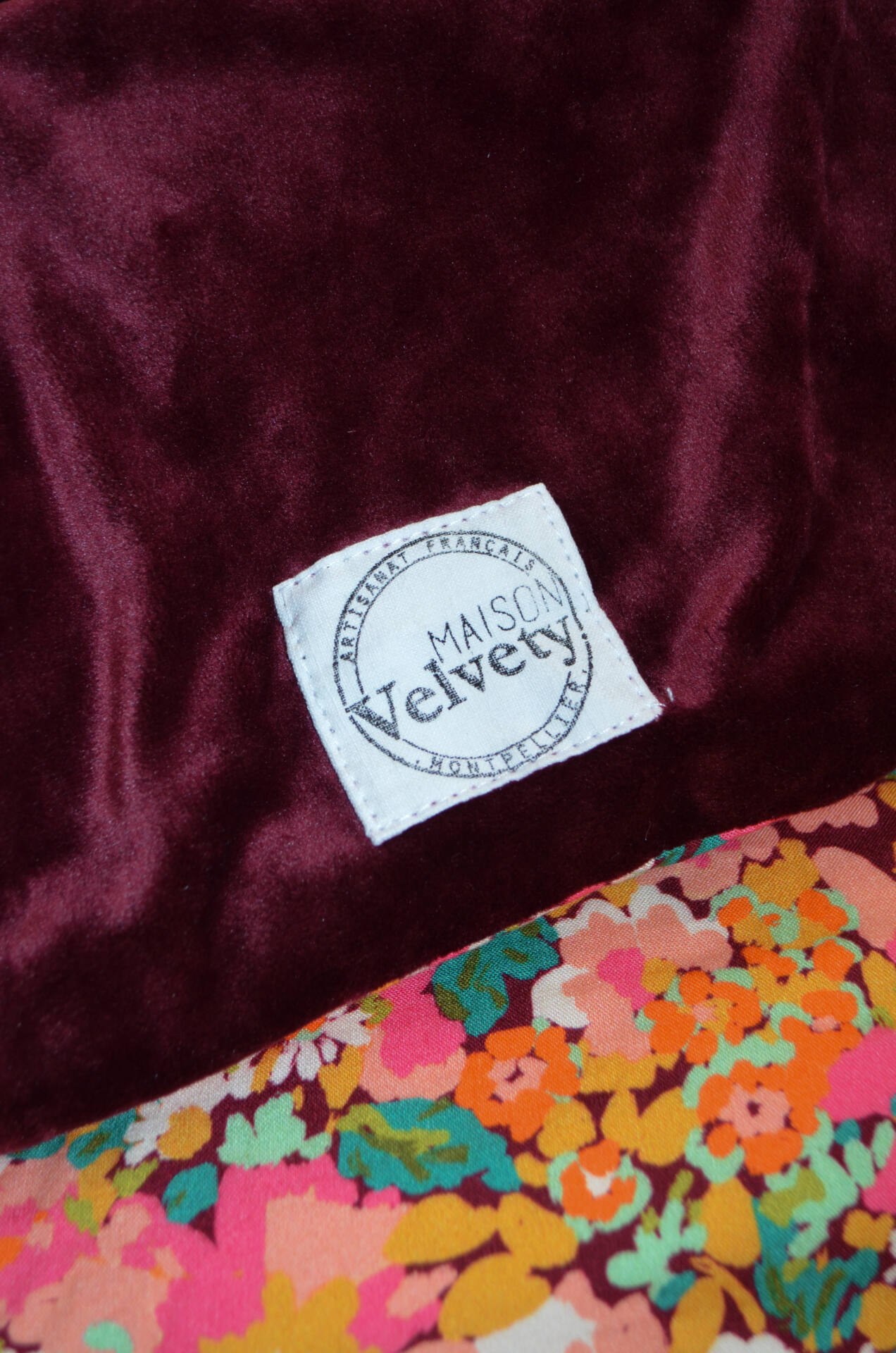 Cette courtepointe prend vie dans l’atelier Maison Velvety, à Montpellier. Chaque modèle est imaginé, coupé et confectionné à la main, en série limitée.