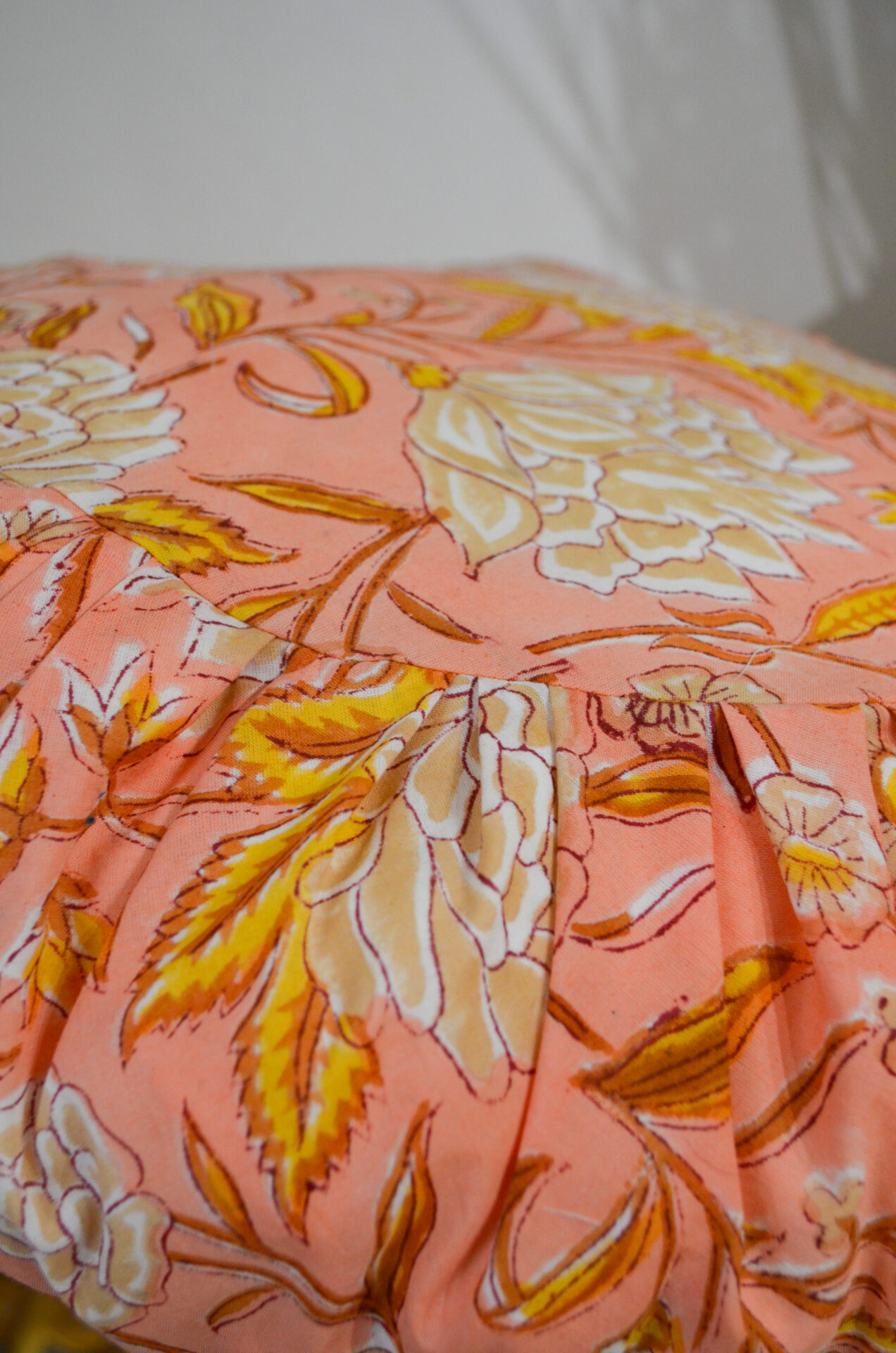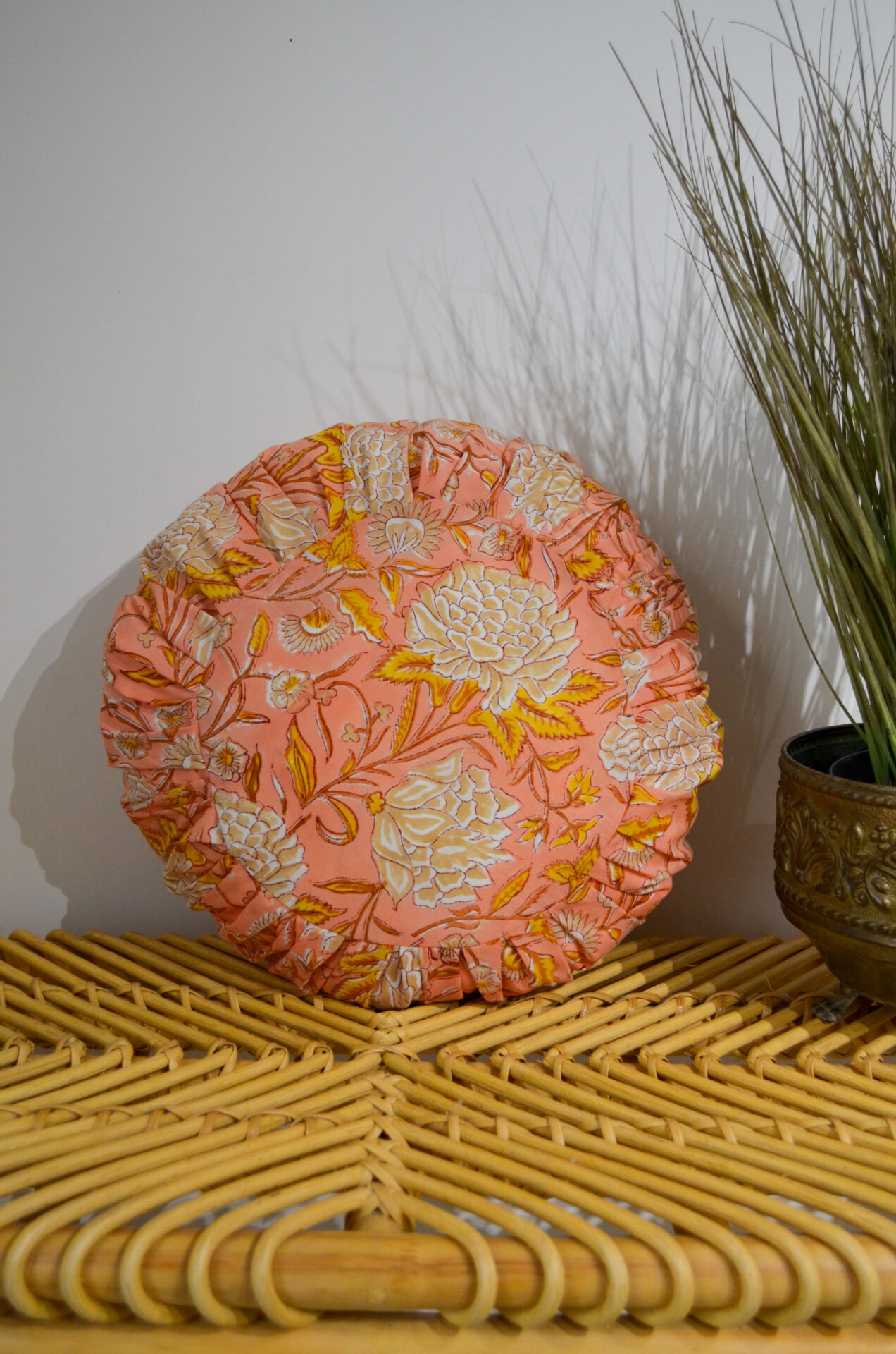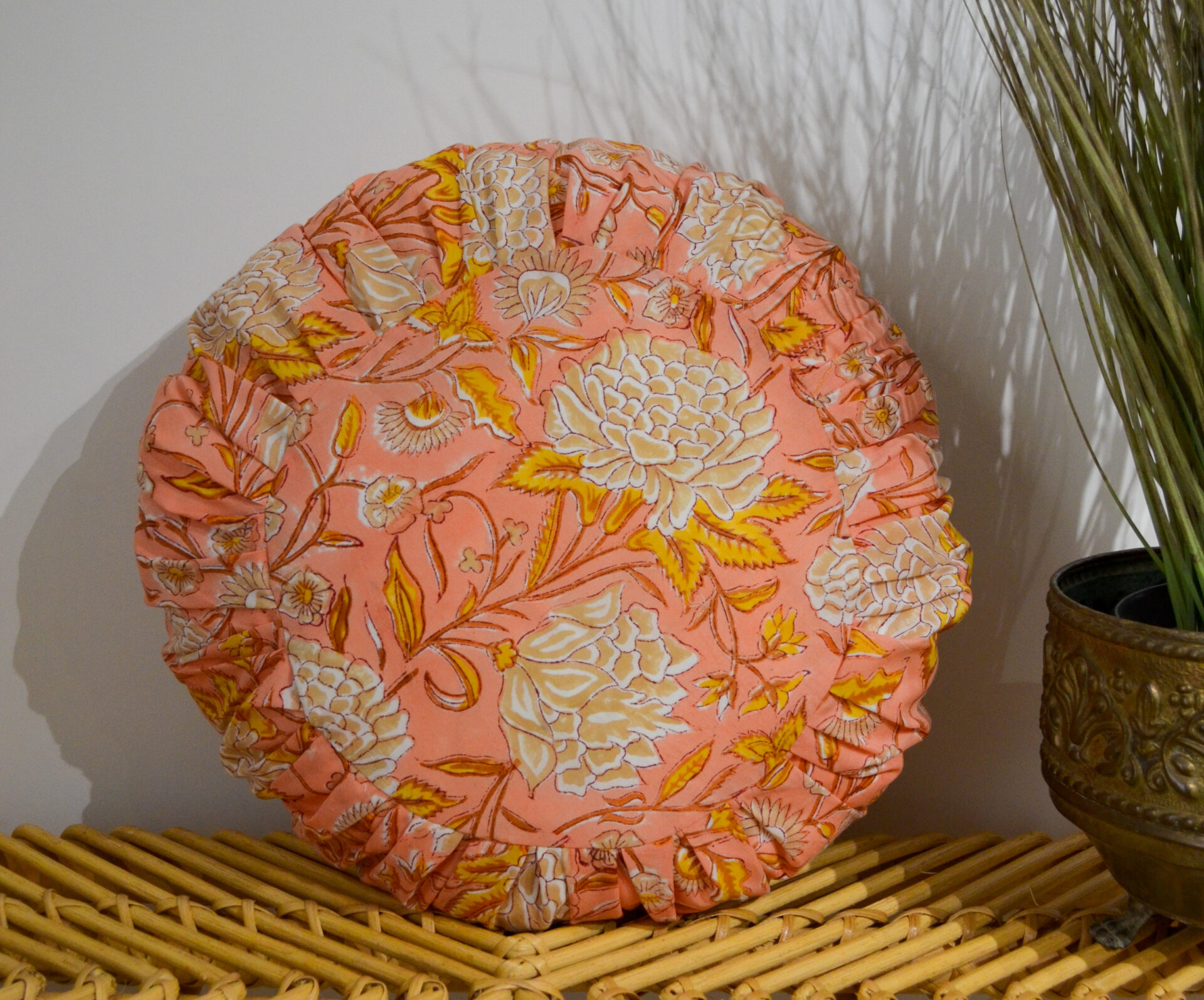 Coussin rond 40cm – FAIT MAIN en FRANCE – coton fleuri blockprint plissé